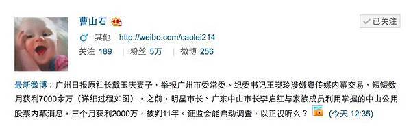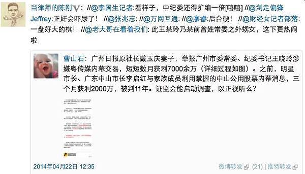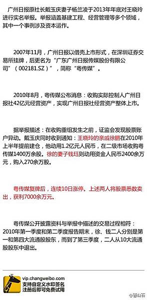 北京時間4月22日12:35,新浪博主曹山石發帖稱:廣州日報原社長戴玉慶妻子,舉報廣州市委常委、紀委書記王曉玲涉嫌粵傳媒內幕交易,短短數月獲利7000餘萬(詳細過程如圖)。之前,明星市長、廣東中山市長李啟紅與家族成員利用掌握的中山公用股票內幕消息,三個月獲利2000萬,被判11年。證監會能啟動調查,以正視聽麼?