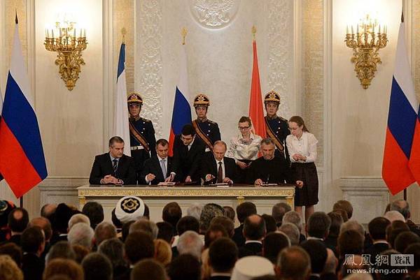 3月18日普京和克里米亞三領導人在莫斯科簽署克里米亞加入俄羅斯的文件。 普京兼併克里米亞,東歐改局已是既成事實。至少在相當長一段時間內,無論美國和歐盟、日本如何制裁俄羅斯,普京都不會改變初衷,不會面對制裁屈服。