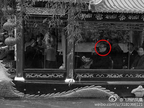 從網民發的圖片中可以看到,江澤民一臉陰沉,再沒有去年4月在揚州瘦西湖泛舟時「緊盯倒茶小姐不放」的興緻。自去年遊揚州後,江澤民久未露面,特別在中共前常委多次集體「出席」時,獨缺江澤民。直到今年習近平出訪歐洲期間,3月27日才在央視「露臉」 出書。