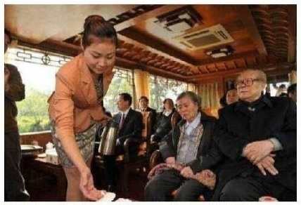 2013年清明節期間,江澤民一家到江蘇揚州「祭祖」,在遊船上又開始緊盯女服務員的醜態照片在網上熱傳。(網絡圖片)