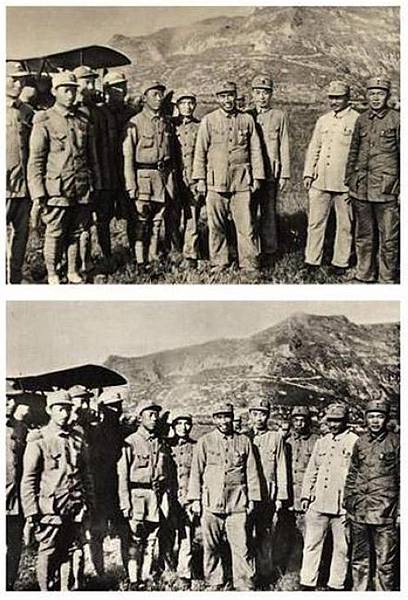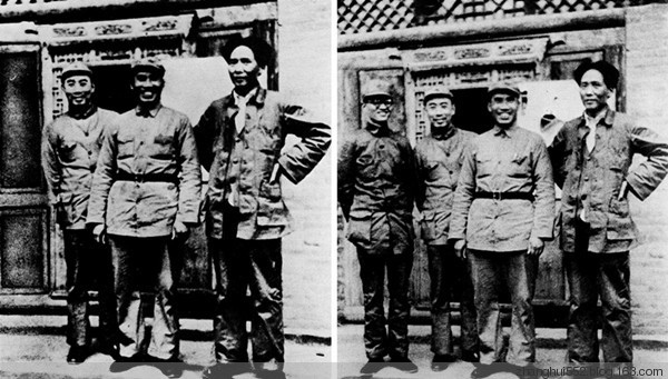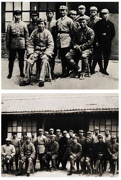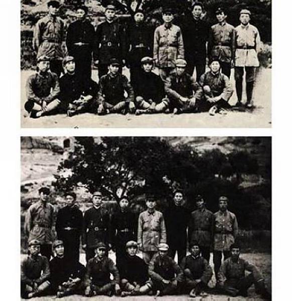 1937年,中共中央蘇區的戰友在紅軍大學裡與毛澤東、朱德合影。至1986年,中國大陸公開出版物上使用的仍是修改過的照片(上圖)。下圖前排左起:聶鶴亭、毛澤東、朱德、林彪、何長工、周子昆、賴毅;後排左起:楊得志、梁軍、楊梅生、陳賡、賀子珍、姚□、胡榮奎、蕭新槐、江華、譚家述、譚冠三、劉型、張際春。(網絡圖片)
