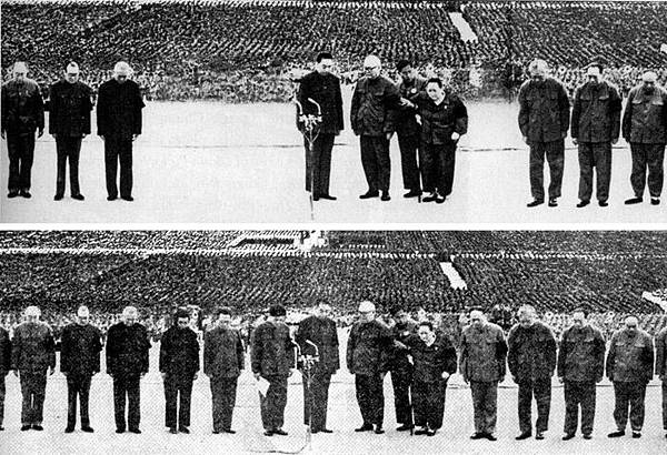 毛澤東等人身後撐傘的工作人員和傘都被刪去。(網絡圖片)