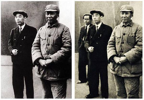1940年周恩來從共產國際歸來時與任弼時、毛澤東合影。左圖修掉了任弼時,原因是後來任弼時遭到了批判。(網絡圖片)