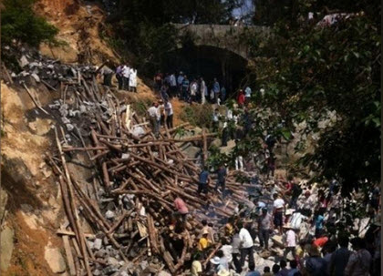 5月3日,中國大陸廣東茂名高州一條在建石拱橋發生崩塌,超過25人被埋,5人死亡8重傷。(網絡截圖)