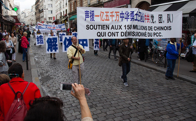 曾有民間高人四個字預言中共命數,其中3字已應驗另一字正在應驗中。2004年底,《大紀元》系列社論《九評共產黨》橫空出世,引發了洶湧的退黨大潮。圖為2013年10月5日,法國巴黎聲援一億五千萬中國民眾退出共產黨大遊行。(大紀元)