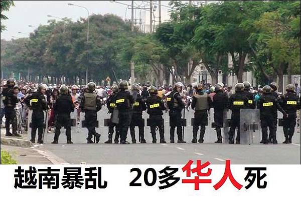 越南多個城市連日舉行了遊行示威活動,抗議中國中海油在南海的鑽探行動。抗議活動演變成暴動。部份大陸商家和台商企業被砸,甚至遭到縱火。傳有20多人死亡,其中16名為華人。對於在反華暴動中中資企業的損失和死傷人數,大陸媒體統一口徑,不作具體報導。華人紛紛離越返家避禍,機票一票難求,而大陸多家航空公司的票價狂漲數倍。