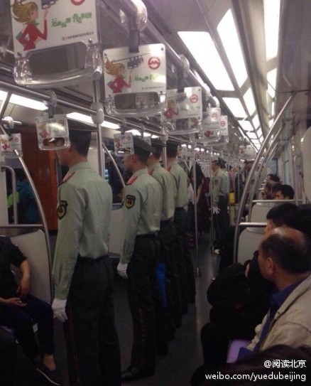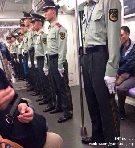 5月20日,大陸網絡熱傳2張上海地鐵武警成排站立的圖片。照片顯示,在地鐵車廂內,一排武警面無表情面對乘客站立。