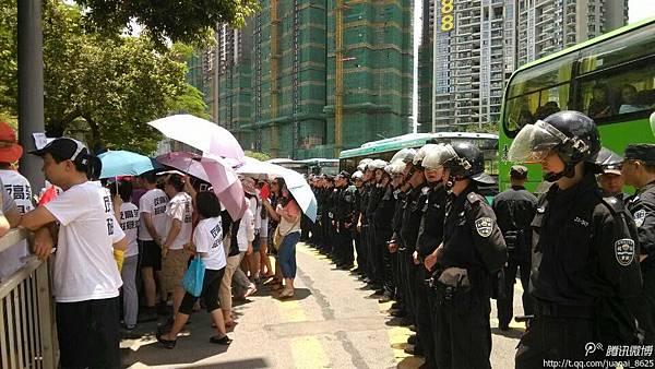 5月25日,廣東深圳上千居民準備遊行到羅湖區委請願,抗議深圳8號線採用磁懸浮高架地鐵方案危害居民健康。當局派警察阻撓。(網絡圖片)