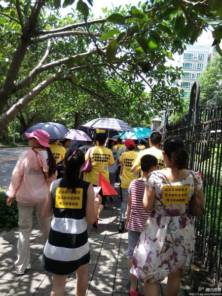 現場圖片顯示,大批居民身穿黃色或白色短袖衫,上面印有「支持輪軌制地下鐵 反對磁懸浮高架線 保我幸福家園」等字樣,在馬路輔道上遊行示威。而羅沙路沿路12個小區的高樓上懸掛了大量標語、條幅,表達居民反對的心聲。