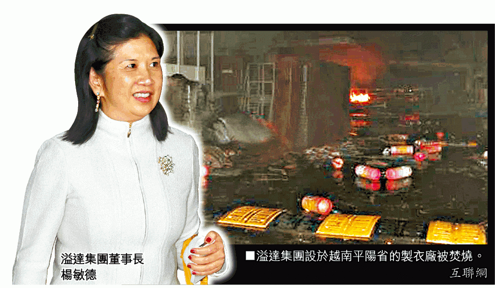 香港行政會議前成員楊敏德旗下的跨國製衣集團溢達位於平陽省的製衣廠亦受波及,該公司管理層證實,部份廠房被燒毀及破壞,港人管理層已撤離。有示威者揚言今日再到該工廠破壞。溢達客戶包括A&F、無印良品、馬莎、Ralph Lauren等國際品牌。楊敏德是上海紡織大亨楊元龍之女,因溢達在新疆有大片棉花田,前特首曾蔭權戲稱她為「棉花公主」。