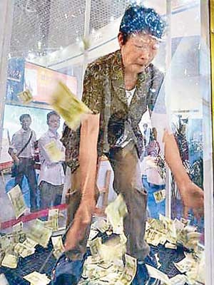 據港媒報導,2014廈門春季房地產展示交易會於開幕時,有商家設置「搶錢機」,市民在機內搶得的人民幣可歸其所有。