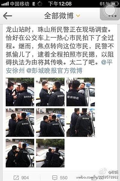 據大紀元記者查實,《彭城晚報》有記者名叫雍君,並用這個「彭城晚報雍君」作為新浪用戶名,每天都發表不少信息。但新浪最後一條微博是5月2日臨近中午時,他推出「五一街頭拾趣」一組圖片後,至今沒有更新微博。根據新浪該記者的微博號上的頭像,跟網上披露5月3日記者與徐州特巡衝突時上圖片應是同一個人。
