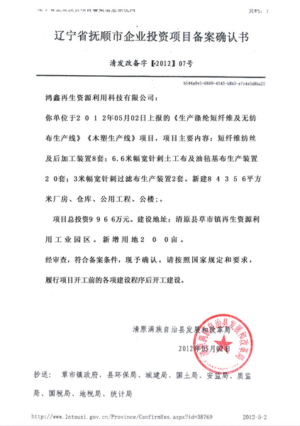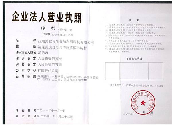 他說:「2011年,我為了回報家鄉,我在家鄉成立了鴻鑫再生資源利用科技有限公司,我任法人,同時,聘請了高級工程師組成了研發團隊和管理團隊。一年半的時間我們研製出來了五大系列、十多個品種,並申請了三項專利。」張洪濤還提到:「2011年10月至2012年2月,我曾兩次去浙江寧波參加了遼寧省的招商會,我的公司受到了遼寧省省長和撫順市市長的特別關注。」