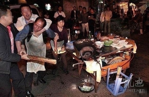 欺軟怕硬的真實寫照,欺負手無寸鐵的、只是討口飯吃的貧民。這些城管(穿西服的土匪)不懂即使生活在社會的最底層也是有尊嚴的。(網絡圖片)