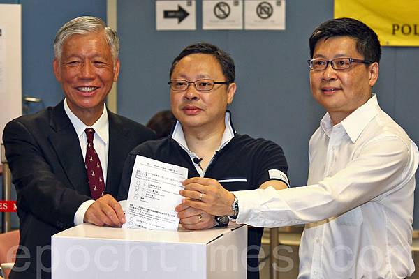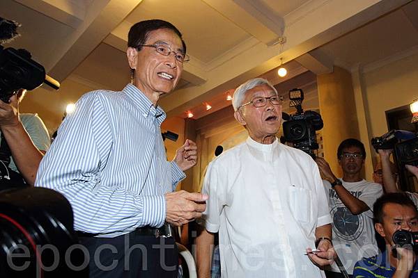香港政改方案民間公投,6月22日正式進入實體投票階段。香港民主黨創黨主席李柱銘(右)與天主教香港教區榮休主教陳日君(左)樞機,一同在香港柴灣慈幼會修道院投票。(蔡雯文/大紀元)
