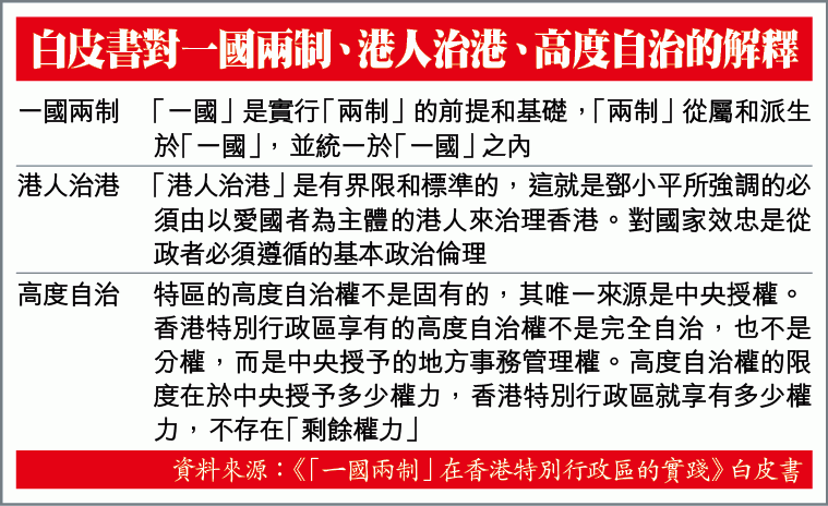 至於「港人治港」,也是有界限和標準的。白皮書指出,這就是鄧小平所強調的必須由以愛國者為主體的港人來治理香港。愛國是對治港者主體的基本政治要求,如果治港者不是以愛國者為主體,「一國兩制」在香港的實踐就會偏離正確方向,香港的繁榮穩定和港人的福祉也將受到威脅和損害。
