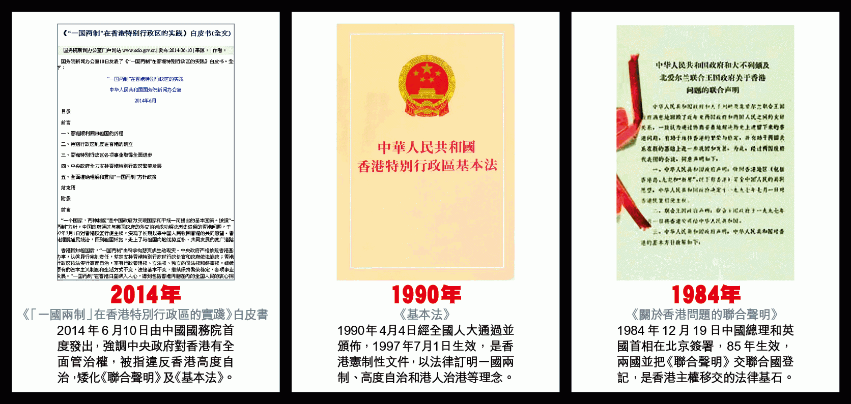 國務院首次就香港事務發表白皮書,長達2.3萬字的文件,對《中英聯合聲明》訂明的治港方針提出嶄新演繹,文件第五節「全面準確理解和貫徹『一國兩制』方針政策」中指出,中共是單一制國家,中央政府對香港擁有全面管治權,香港的高度自治權不是固有的,其唯一來源是中央授權。