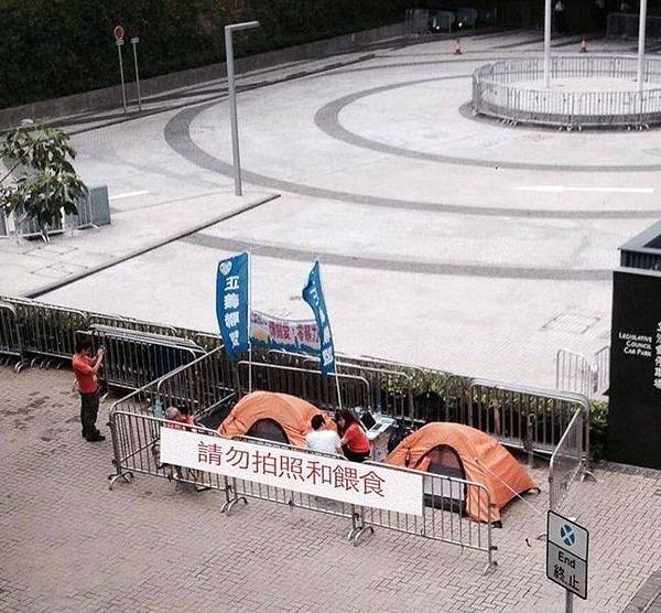 港人抗共、拒共的民主浪潮讓中共害怕不已,22日頗具爭議的香港親共社團「正義聯盟」召集人李偲嫣到香港金鐘政府總部門前安營「絕食」。圖為,李偲嫣扎營照片被惡搞,禁拍照和餵食,彷如置身獸籠外。(網絡圖片)