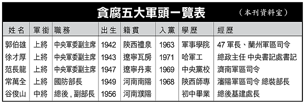 可見郭伯雄和徐才厚在軍中植根很深,他們仍以為范長龍是他們安插的,其實范長龍後來已被胡錦濤拉攏,於二○一二年十一月直接從濟南軍區司令員升為軍委副主席,成為胡錦濤的人。照理軍委副主席必須先有軍事委員會委員身份,但范長龍沒有軍委身份,直接由軍區司令員提拔上來,他該多麼感謝胡錦濤的提拔。到了習近平上台,因為胡習聯盟對付江派在軍中的勢力,范長龍又自然倒向習近平,繼續當了現在的軍委第一副主席。