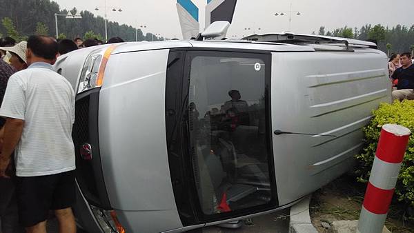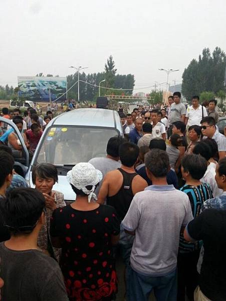 閆姓村民說:「當時,那些特警強行要把被扣的特警帶走,村民看到那輛開來的麵包車上裝有鐵鉛、鐵棍等工具,大家都著急了,把車圍起來,然後把這輛麵包車推翻。」