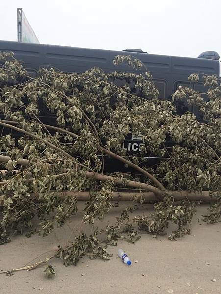 「這些特警開來的特警車,把車牌照摘了,身上警服的警號也撕了。因此,村民用砍斷的大樹把車擋住,不讓開走。」閆姓村民說。