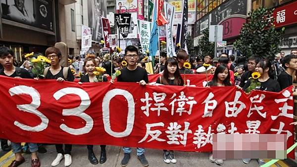 ●台灣318 學運迅速引起國際反應與聲援。同樣面對中共壓力的香港人心連心上街示威。