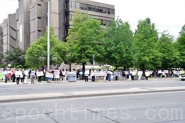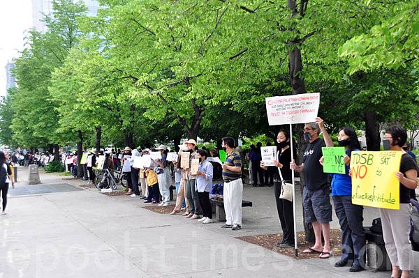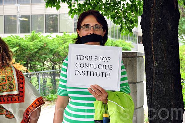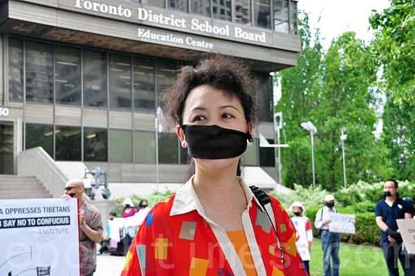 6月18日,民陣全球主席盛雪在多倫多教育局大樓外請願,要求叫停孔子學院。(周行/大紀元)