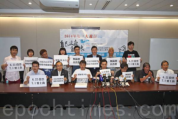 香港民間人權陣線6月5日公布今年七一大遊行的主題是「公民直接提名,廢除功能組別,要求梁振英下台」,希望在近日感動全城的《問誰未發聲》一曲呼喚下,出席人數可再創紀錄。(潘在殊/大紀元)