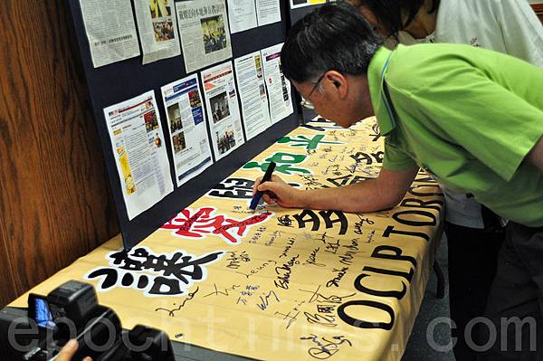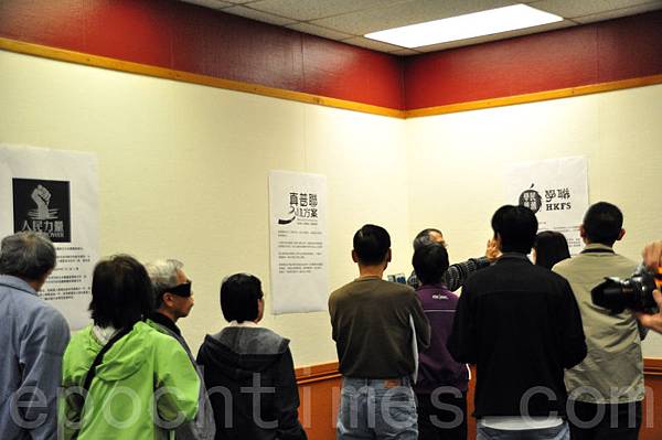 6月14日,加拿大香港人在多倫多Hillcrest圖書館排隊參加民間就香港政改的投票。牆上貼的是在之前討論中出線的3個政改方案。(周行/大紀元)