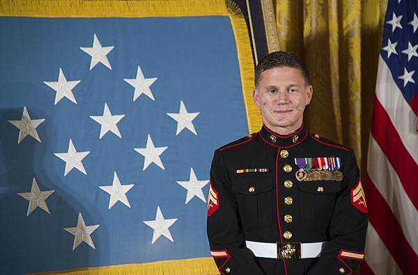 2010年在阿富汗為同伴擋手榴彈的海軍陸戰隊士兵卡本特,從死亡線上奇蹟般被搶救回來之後,活著獲得總統頒發的美國最高軍事榮譽勳章。(Chip Somodevilla/Getty Images)