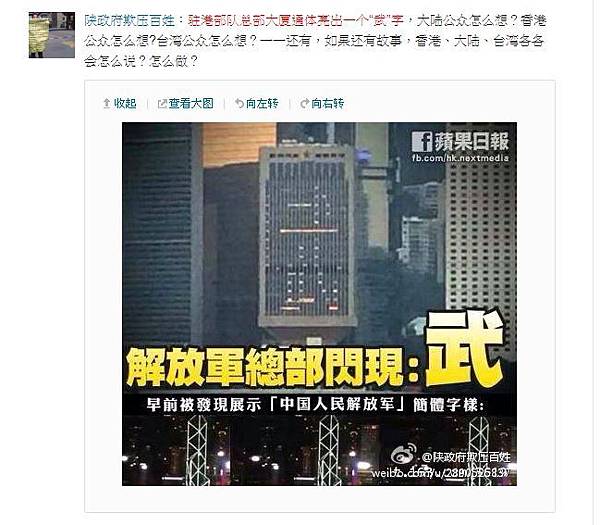 6月14日,有香港市民發現中共駐港部隊總部外牆燈飾亮起一個「武」字。