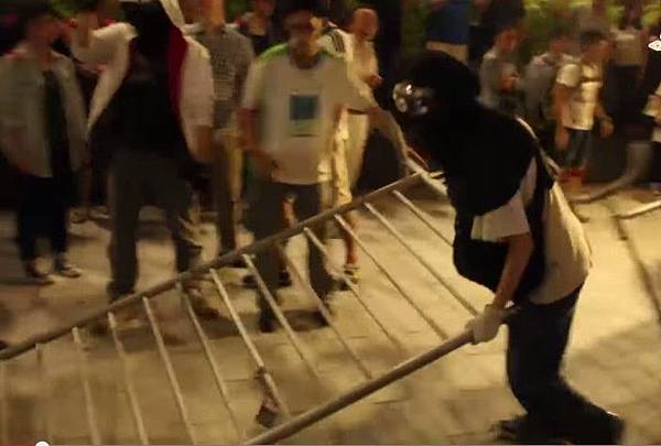 上週五立法會財委會審議新界東北發展計劃前期撥款,激起過千名反對拆遷的村民與支持者在立法會外抗議,期間一群身份不明的蒙面人以暴力手法衝擊立法會,他們的背景引起泛民主派懷疑。(網絡截圖)