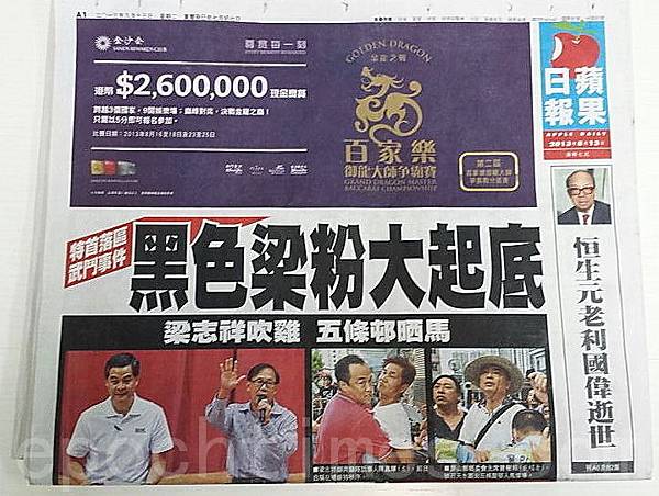 2013年8月,香港梁振英上週日落區諮詢,在場外發生挺梁人士毆打反梁人士事件。有媒體專訪當日高調在現場打點的曾樹和,標題就是很恐嚇性的:「挺梁號召人:就想流血衝突」,頭版的左上方:「余若薇:樂與中共密室談判」,更是一個暗示,與頭條文章的訊息,互相呼應。(大紀元資料圖片)
