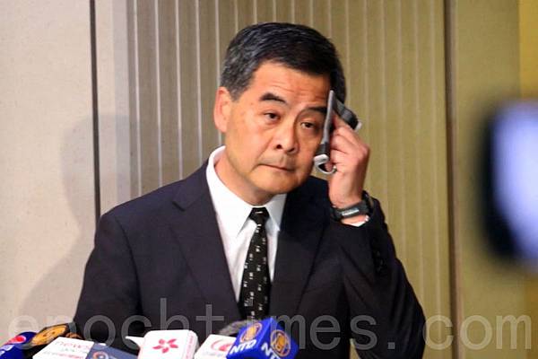 白皮書發表後,梁振英突然高調召開記者會,不時抹汗,看似逃過一場危機。(潘在殊/大紀元)