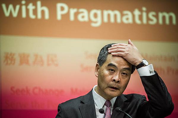 近74萬人公投創出奇蹟,但梁振英卻一轉常態,竟單方面聲稱,大部份投票的市民是與他自己、中央、特區政府的願望一致,希望落實2017年普選,遭到香港媒體批其厚顏騎劫民意。(AFP PHOTO / Philippe Lopez)