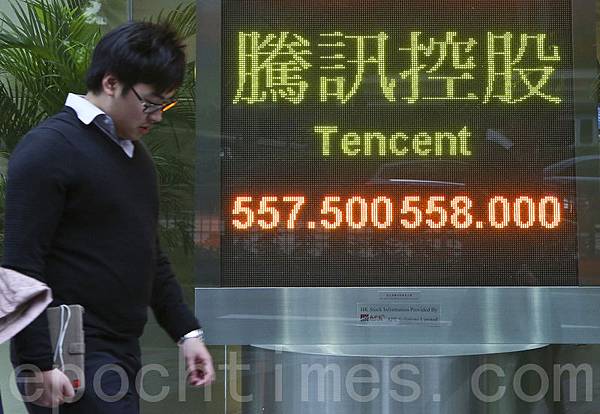 2011年年底騰訊股價還不到200港元,而到2014年初就高達6百多港元,市值翻了兩番。圖為騰訊控股宣布股票一拆五之前,更飆升為香港的股王。(余鋼/大紀元)