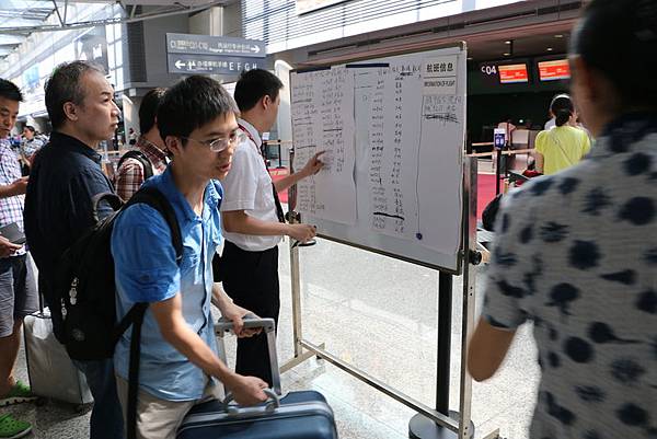 7月21日,上海虹橋機場幾位旅客在閱讀機場公告。從7月22日開始,上海等地共12個機場因受航空管制,將持續26天航班取消。(大紀元資料室)