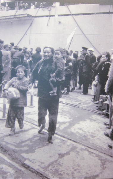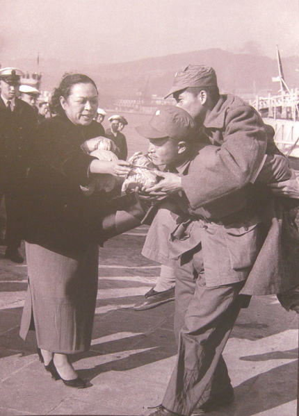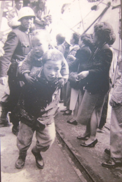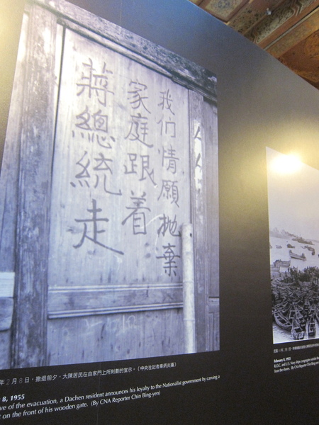 「我們情願拋棄家庭,跟著蔣總統走」、「歷史告訴我們:奸匪必滅、侵略必亡。」這正是台灣中正紀念堂展出的「島嶼、碼頭、新故鄉:大陳島撤退影像紀實」中的部份照片,畫面記錄在1955年2月8日撤退前夕,大陳居民在自家門上所刻畫的宣示。當年許多的照片可看出準備撤退的大陳居民,扶老攜幼,大包小包等待出發,他們臉上仍帶有依戀之情。