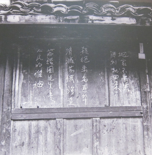 1955年2月8日撤退前夕,大陳居民在自家門上所刻畫的宣示:「我們情願拋棄家庭,跟著蔣總統走」。(鍾元翻攝/大紀元)