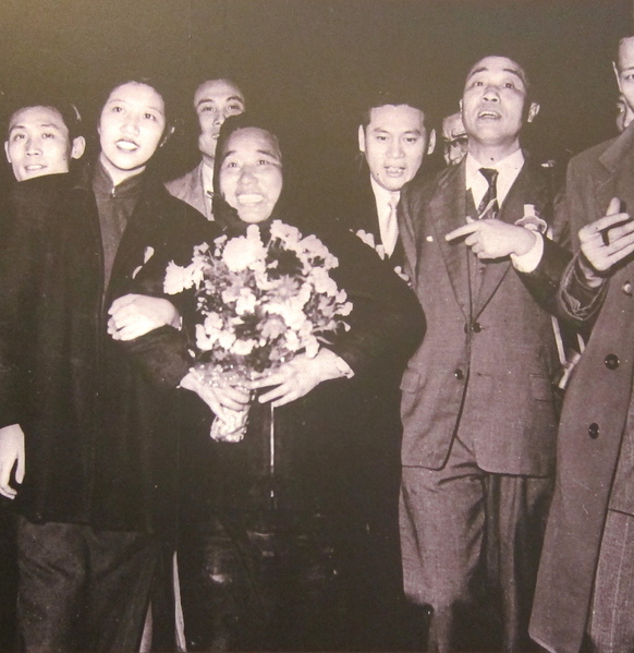 1955年2月10日,游擊名女將雙槍黃八妹(黃百器)率大陳孤兒抵台,黃八妹下船接受獻花後被記者們包圍。(鍾元翻攝/大紀元)