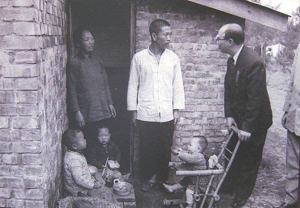 1956年2月8日,台灣省主席兼大陳義胞就業輔導委員會主任委員嚴家淦一行訪問大陳義胞,探詢生活狀況。(鍾元翻攝/大紀元)