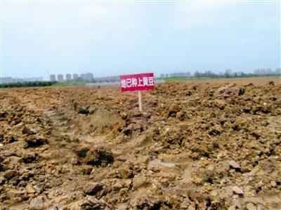 江蘇省泗洪縣新修的馬路被蓋上黃土並種上黃豆,還立上“地已種上黃豆”的標識牌。(網絡圖片)
