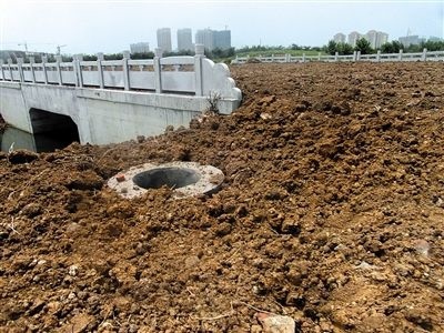 江蘇省泗洪縣被黃土覆蓋的大橋,橋欄杆和下水井赫然露出。(網絡圖片)
