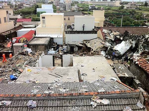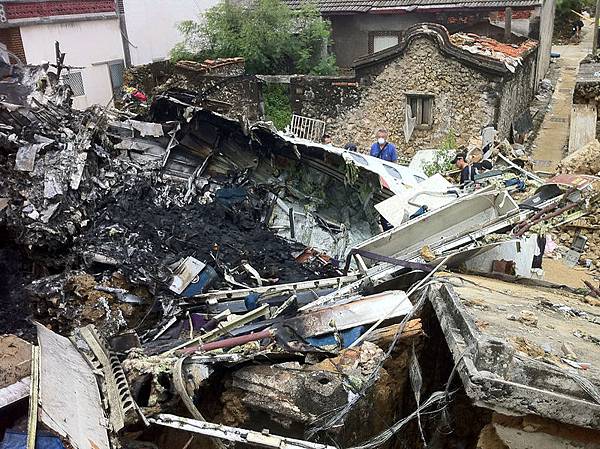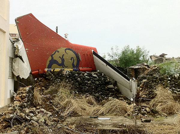 復興航空GE222班機23日晚間在澎湖馬公重飛失敗墜毀,造成48死10傷慘劇,失事現場一片狼藉,四處可見機體殘骸。(中央社)