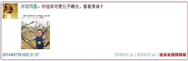 7月16日,網民「作家鳳凰」微博發佈帖文稱:「宋祖英可愛兒子曝光,看看像誰?」並附有兩張不同的照片。