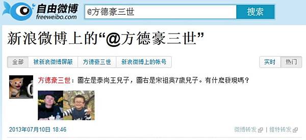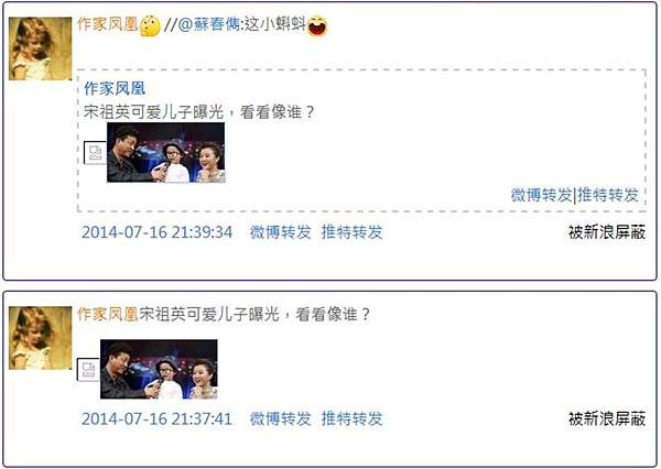 7月16日,網民「作家鳳凰」微博發佈帖文稱:「宋祖英「可愛」兒子曝光,看看像誰?」(網絡圖片) 7月10日,網民「方德豪三世」微博發佈附圖帖文稱:「圖左是泰尚王(太上皇)兒子,圖右是宋祖英7歲兒子。有甚麼發現嗎?」該帖文和圖片也被迅速刪除。