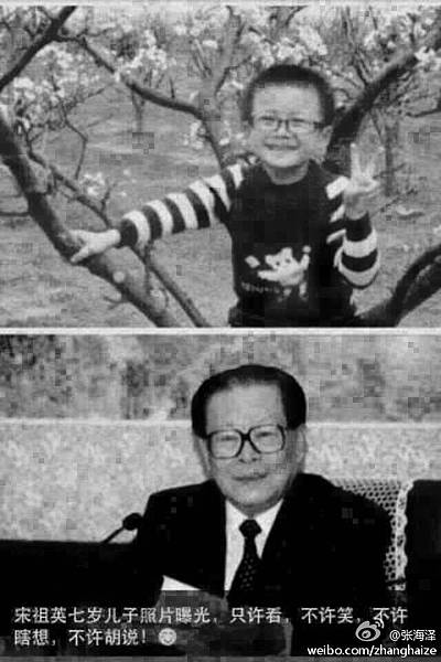 日前,網絡瘋傳一張「宋祖英7歲兒子照片」,網民跟帖稱,「看看像誰」、「太像了」;直接影射中共前黨魁江澤民。相關照片和帖文目前在大陸微博遭刪除。