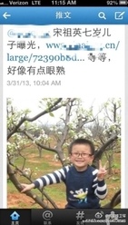 日前,網絡瘋傳一張「宋祖英7歲兒子照片」,網民跟帖直接影射中共前黨魁江澤民。(網絡圖片) 目前,在大陸新浪微博搜索「宋祖英 兒子照片」,顯示:根據相關法律法規和政策,部份搜索結果未予顯示。