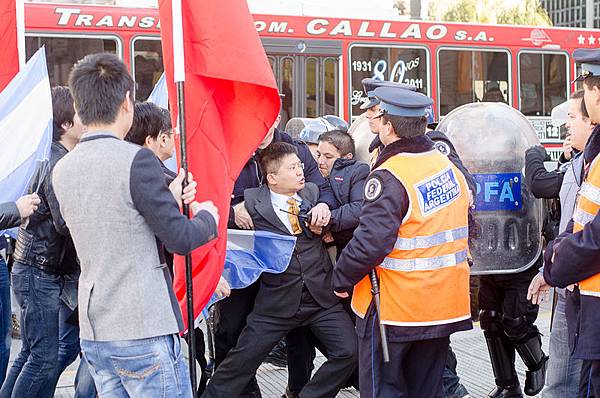 為防止中共打手破壞法輪功學員和平請願,阿根廷防暴警察將中共打手特務和法輪功學員分開。在這過程中,中共阿根廷大使館的一位副武官來到現場,隨後,一群中共僱傭的打手強行撕破數個橫幅。