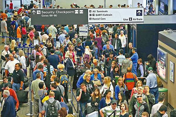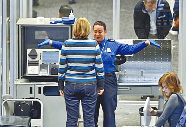 ■一名乘客在三藩市機場搜身區接受安檢員檢查。互聯網